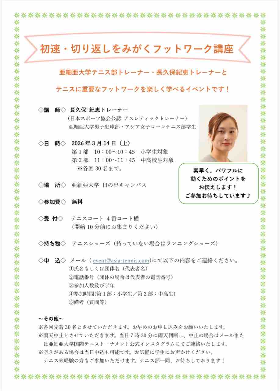 3/14(ÅÚ)¤Ë¡¢°¡ºÙ°¡Âç³Ø¥Æ¥Ë¥¹Éô¥È¥ì¡¼¥Ê¡¼¡¦Ä¹µ×Êݵª·Ã¥È¥ì¡¼¥Ê¡¼¤Ë¤è¤ë¡Ø¥Õ¥Ã¥È¥ï¡¼¥¯¹ÖºÂ¡Ù¤ò³«ºÅ¤·¤Þ¤¹❗️
