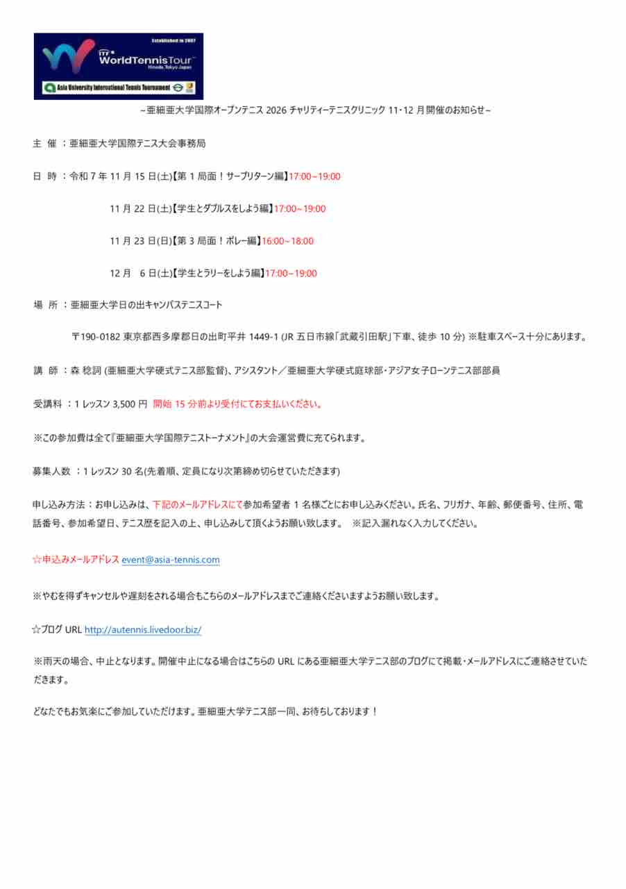 この度、亜細亜大学国際オープンテニス2026開催に先立ち、チャリティークリニックを開催致します!