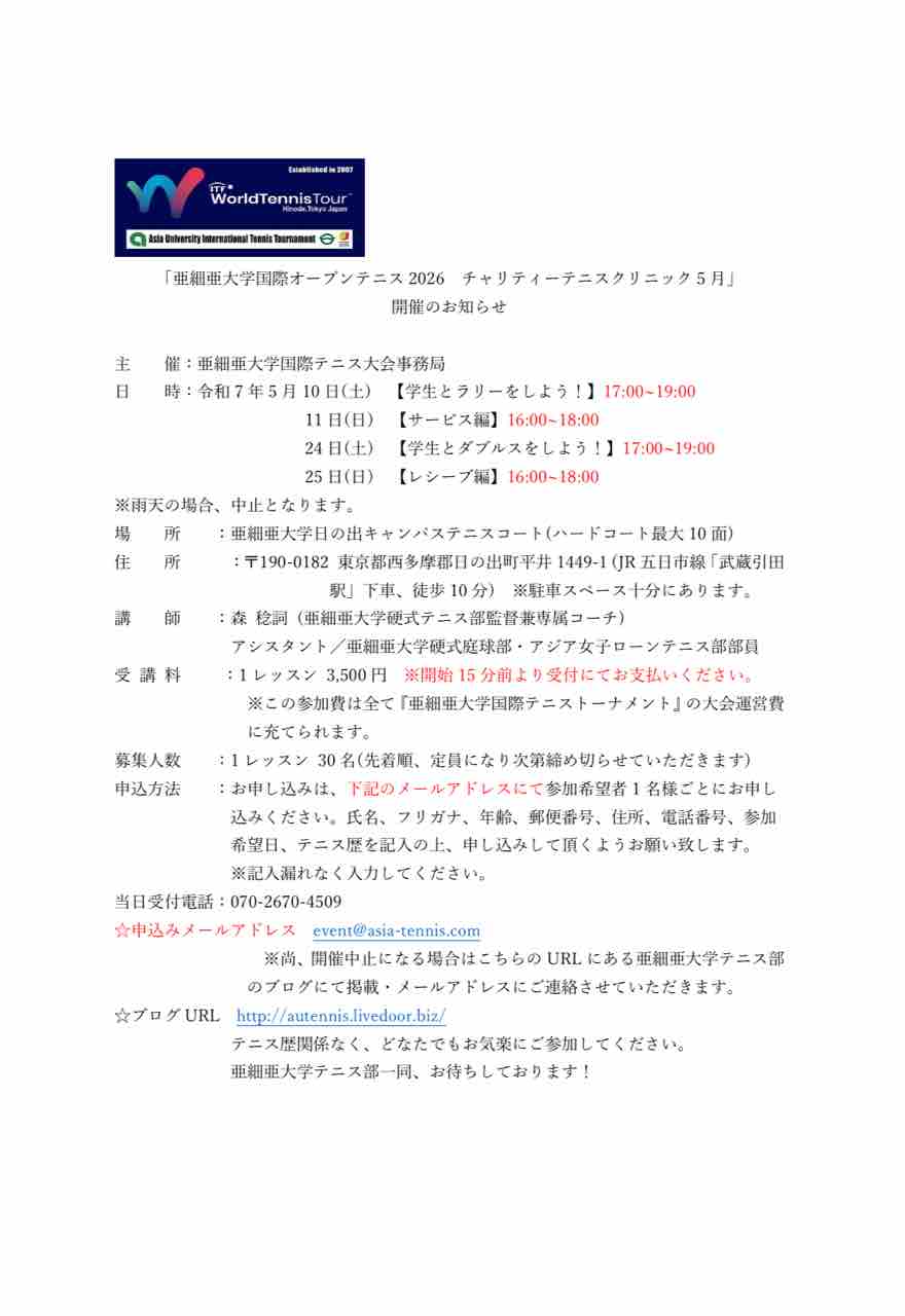 この度、亜細亜大学国際オープンテニス2026開催に先立ち、チャリティークリニックを開催致します!